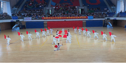 我院代表队作为第一支参赛队伍入场,队员们身着一袭白衣,头扎丝带,手握红扇,排着整齐的队伍井然入场。标准的太极招式、整齐划一的动作、不断变换的队形,更有羽扇张开时那扣人心弦“啪”的一声,无不展现出队员们的翩翩风采。
