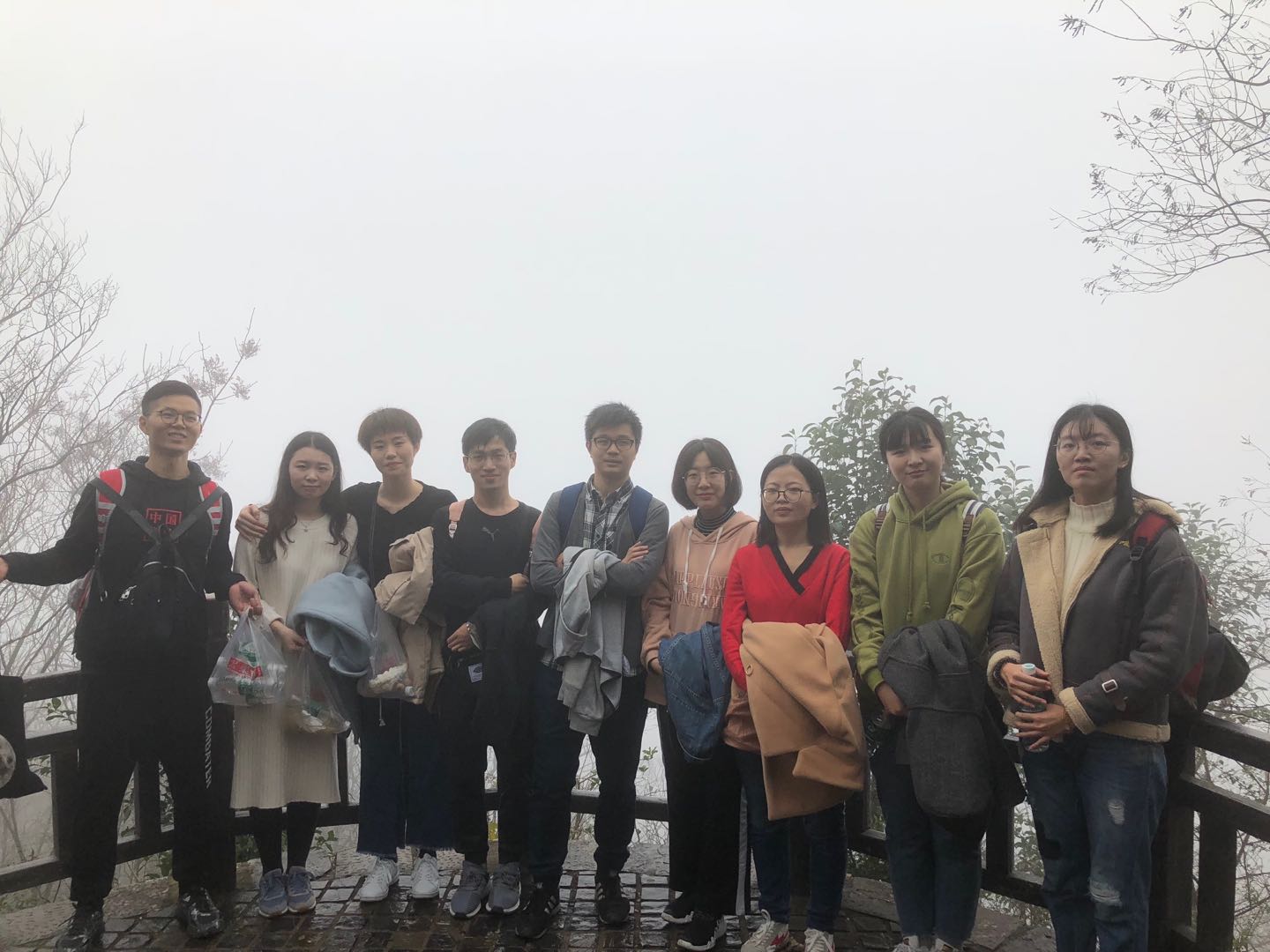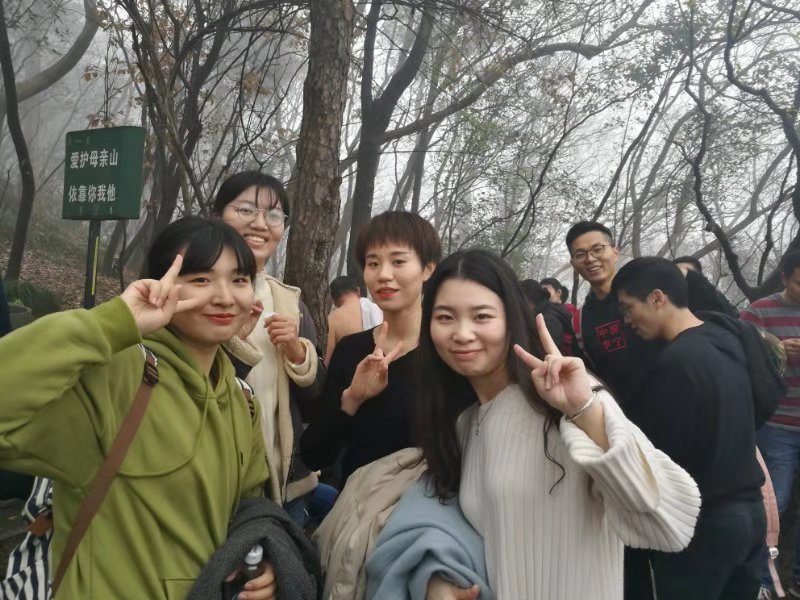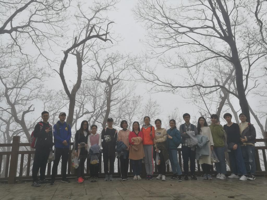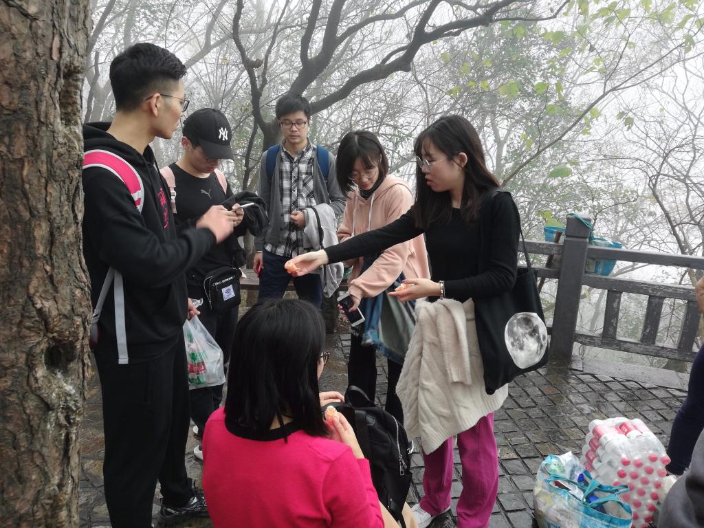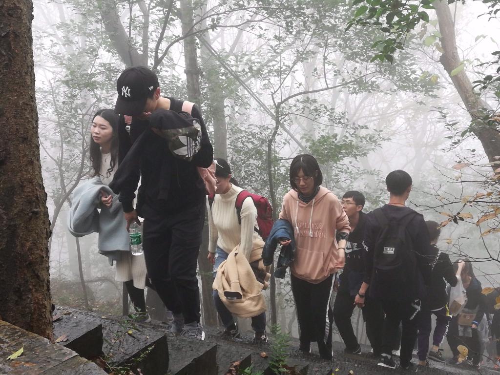 在登山过程中也发生了一些有趣的事情,由于今天的雾气十分重,所以我们戏称我们得道升仙了,每个人都有种腾云驾雾的感觉;半山腰的时候我们跟东南大学研二的学生相互拍照留念,最后我们又在山顶相遇;在路上听着别人说登山辛苦,要把所有密码告诉舍友的调侃;看着六七十岁老爷爷光着上身上山下山;虽然有一个同学因为没吃早饭而不舒服,但是最后还是在调整补给之后登上了山顶。
