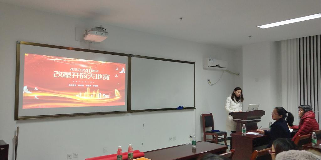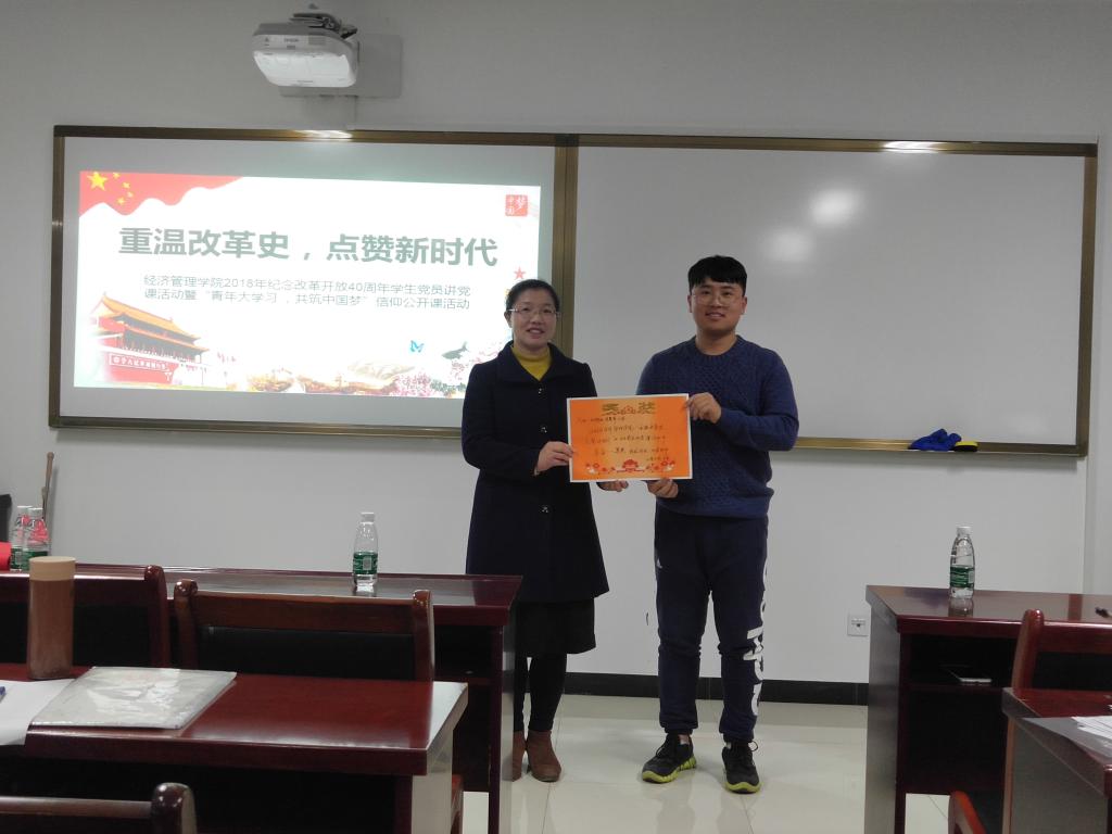 活动围绕改革开放的历程、成就与思考展开,十组党员分别从(1)改革开放与历史转折;(2)对内改革与对外开放;(3)改革开放与乡村振兴;(4)改革开放与城市变迁;(5)改革开放永不止步这五个方面进行党课汇报。本次参与讲课的党员同学材料准备十分充分,讲课内容丰富、形式多样、效果良好。在选题上覆盖了我国改革开放40年来的方方面面。由岑丹、周靖、徐梦沁同学带来的《对外开放——构建人类命运共同体》这一作品,在选题上视野宏观,将改革开放与习近平总书记提到的构建人类命运共同体这一发展理念相结合,体现了他们对改革开放的未来走向与国家及世界前途发展的深刻思考。《改革开放与城市变迁——一南京市为例》是由李佳敏、彭景美、胡志豪同学带来的作品,他们从微观的视角介绍了改革开放40年间,南京城市的发展与变迁。从新街口和金陵饭店这两个标志性地标来展现了古都南京的快速发展。张晓娜、邓黍心的讲述了改革开放与新时代乡村振兴的关系,并通过视频的方式向我们诉说了过去的故事。《饮水当思源,铭记改革路》是张红、高幸、刘贤石同学带来的作品,他们从改革开放的历史转折、历史成就和未来展望等部分和通过各个历史性成就向我们描绘了改革开放的壮丽诗篇。由黄莹、刘晶、张少惠讲述的《坚持改革开放,实施乡村振兴战略——以江苏省乡村振兴典型案例为例》则是结合江苏省乡村振兴的案例向我们讲述了改革开放的故事。其中获奖作品有:周甜甜、刘辉琳、李慧奇的《改革开放——南京走过的四十年》(一等奖)、姚尧、蔡琦雯、范红梅的《改革开放之伟大的历史转折》(二等奖)、付晓伟、牛文静、孔乐兰、周颖《砥砺奋进的改革开放40年》(三等奖)。