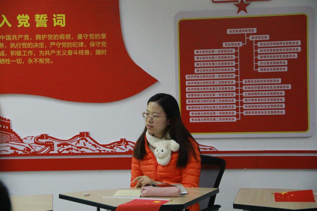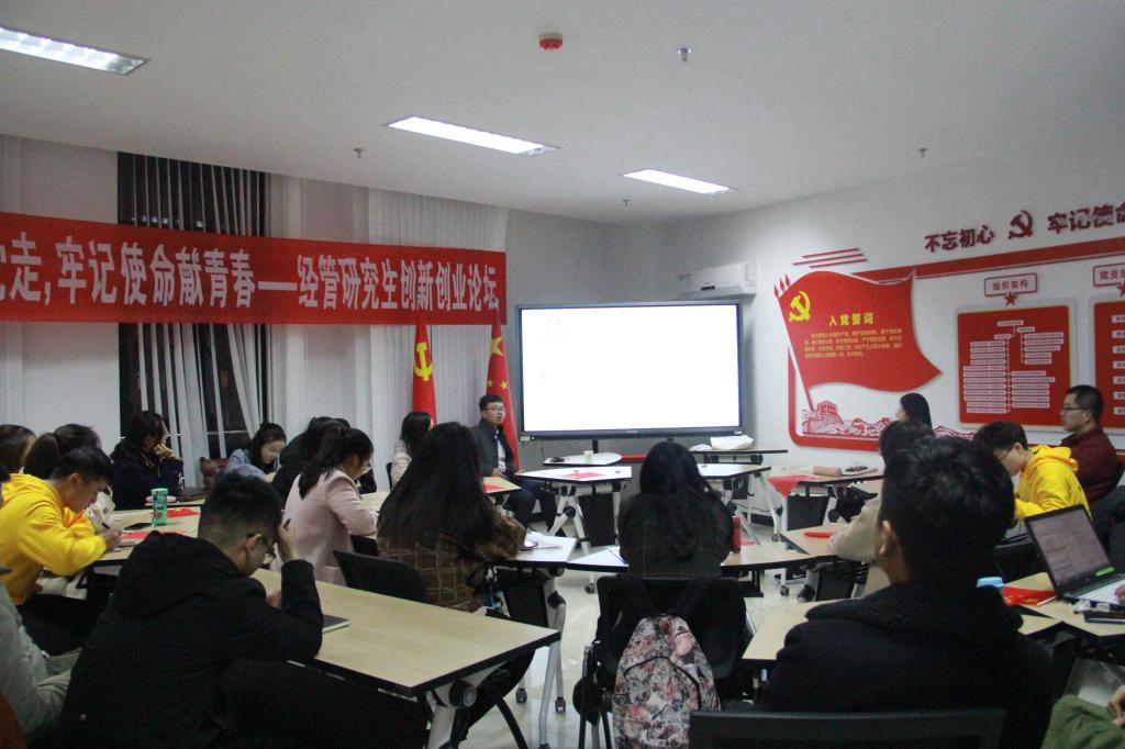 在全校持续深入开展“不忘初心、牢记使命”主题教育的背景下,为营造我院创新创业的良好氛围,推动广大学子积极投身创新创业中,12月10日晚学院在党员实境课堂725室开展了“不忘初心跟党走,牢记使命献青春——经管院创新创业论坛”活动。本次活动邀请2018级研究生党支部书记许永钦(获“创青春”全国大学生创新创业大赛全国金奖)作为主讲嘉宾,为在场研究生分享他参加创新创业竞赛的想法及心路历程等,并通过互动环节进一步加深大家对创新创业竞赛的了解,进一步坚定了不忘初心跟党走,将创新创业的青春气息带入学习生活中。
