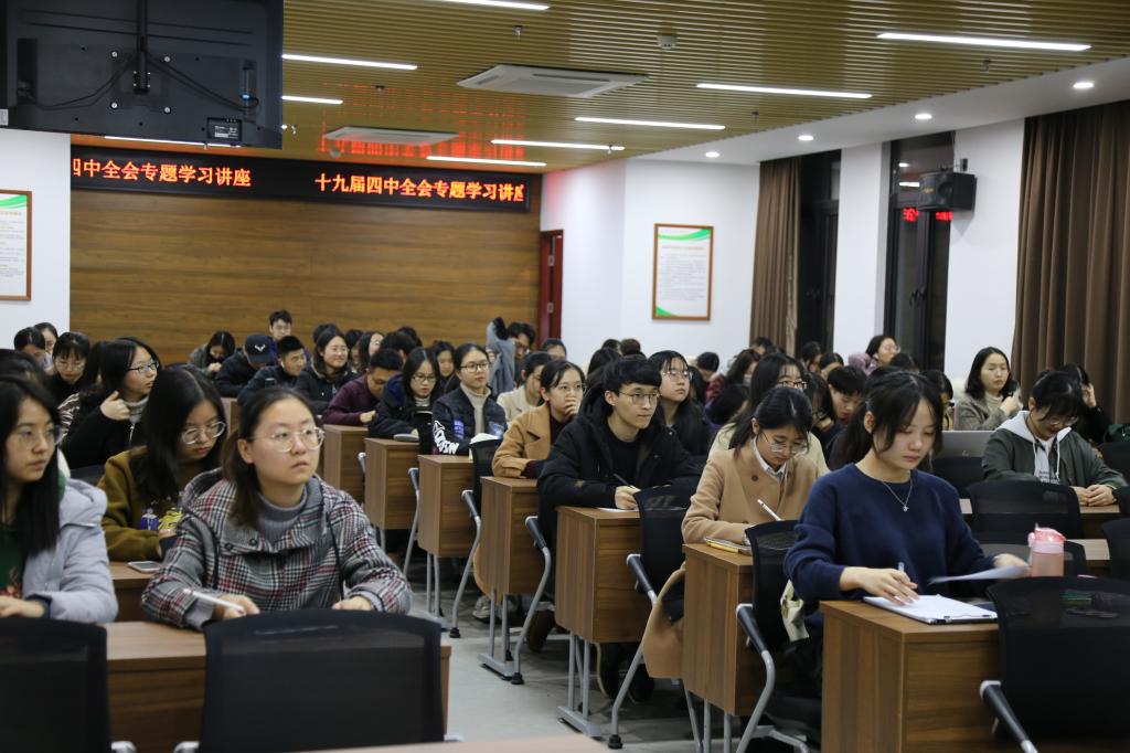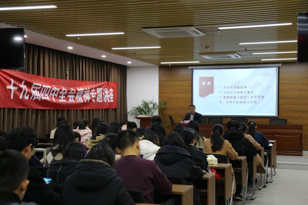 梁玉泉副教授以历史节点上的伟大宣誓为切入点,围绕党的十九届四中全会召开的背景、召开的重大意义,全会通过的《中共中央关于坚持和完善中国特色社会主义制度、推进国家治理体系和治理能力现代化若干重大问题的决定》总体要求、总体目标和重点任务等方面,向同学们传达全会精神。