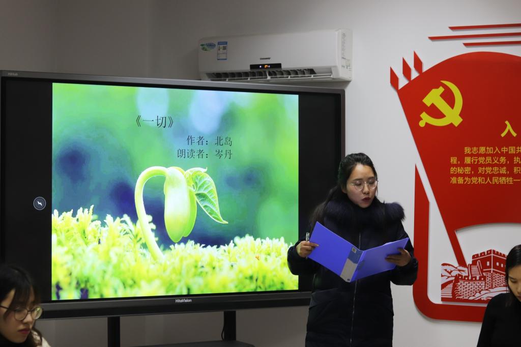 本次活动以7个研究生党支部为依托开展,各党支部准备充分,朗读者精神状态饱满,声情并茂,分享内容丰富、形式多样。19经济硕士党支部的崔允瑞和项莹莹同学和我们分享了路遥的《平凡的世界》,让我们懂得虽然我们身处平凡世界,依旧可以通过自身努力,创造属于我们的不平凡时代。王钇霏同学代表19管理硕士支部以朗读者的形式和我们分享了《不为什么》,妈妈爱孩子,不需要为什么,祖国爱中华儿女,不需要为什么,这是一份无需多言的爱,简单却真挚。我们都知道生活不是一场悲剧,也不是一场完全的喜剧,18经济硕士党支部用真挚的感情朗读了《一切》和《这就是一切》,向我们传递了生活的真谛,启示我们要学会承受,然后为了理想而奋起。潘超同学代表18博士党支部,大声的呐喊出我们的《理想》,我们要有理想,要为崇高的社会理想奋斗终生。19专硕党支部的陈璐同学向我们推荐的是《中国震撼——一个“文明型国家”的崛起》,我们为中国的崛起感到震撼,同时也要为实现中华民族的伟大复兴而付出自己的努力。18管理硕士党支部分享了李大钊的《狱中自述》,让我们感受到了对国家的责任与担当。最后19博士党支部的白雪冰同学和我们分享了《乡土中国》经典名句,给观众留下了深刻的印象。