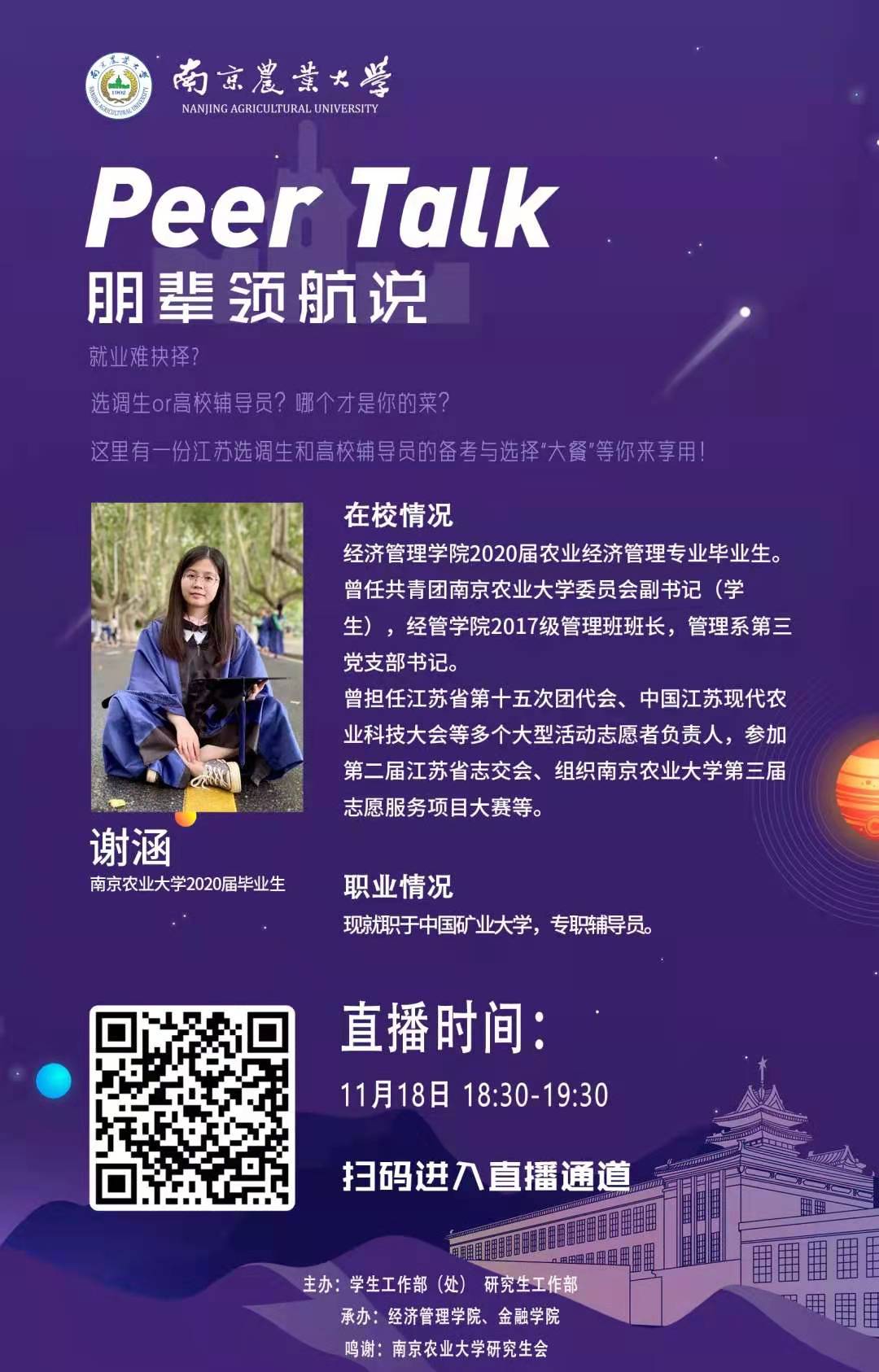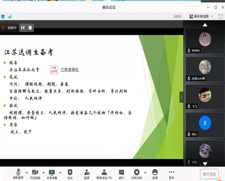 11月18日晚18点30分,以“江苏选调生与高校辅导员的备考与选择”为主题的Peer Talk朋辈领航说活动于腾讯会议(线上)举行,共80余名同学参与此次活动。本次系列活动由437必赢会员中心研分会与金融学院研分会联合承办。