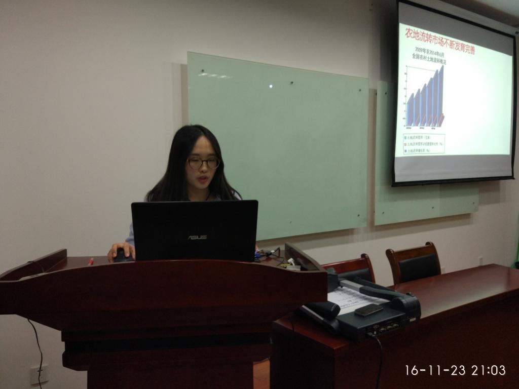第三位汇报的同学是谭鑫,她的题目是《农地流转市场发育对粮食种植比例调整有影响吗?》。文章首先用两幅图展示了农地流转市场不断发育完善的现象,从而提出了“在粮食生产种植比例不断调整变化的动态过程中,农地流转对粮食种植比例的调整产生了怎样的影响?”这个问题。通过2009年初吉、冀、陕、川、苏5省调查,2014年其中3省的跟踪调查形成302个样本村三期面板数据进行实证分析。得出“农地流转促使农户调整产品选择和要素投入结构,总体上导致耕地粮食种植比例下降。并给出“科学认识土地流转政策并判断在此背景下我国粮食生产种植变迁的趋势,将工作重点放在强化对其监督管理方面,同时组织促进地力提升与零散土地的整合的工作。大力支持农业机械技术的研发和创新,将提升平原地区机械化水平与推动丘陵山区农业机械化进程并举。发展多种形式的农业社会化服务,构建并完善农业公共服务体系。”政策建议。