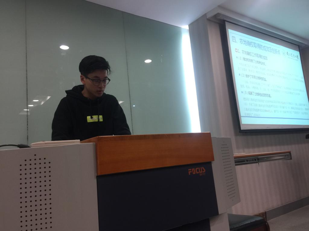 安康同学汇报的题目是《全国农村承包地确权登记颁证工作——安徽省农地确权的状况》。这篇文章基于安徽省界首市、金安区和庐江县三个地区的实地调研和访谈,分析了安徽省农地确权工作的总体情况,列举出安徽省在农地确权工作方面的主要举措及其在领导机制、操作流程、问题处理、数据档案管理等方面取得的成效和创新点,同时从组织层面和操作层面针对确权工作中存在的问题和风险提供了建议与对策。