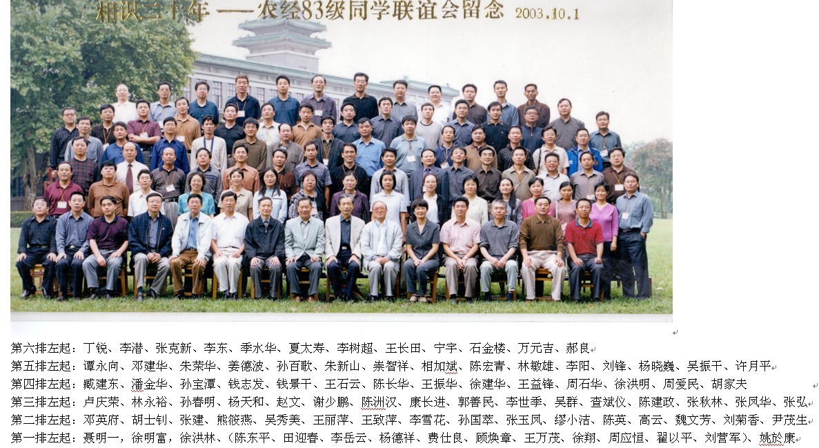 1983级毕业(1987年)时没有照全体照。此为农经83级“相识二十年”活动的合影。