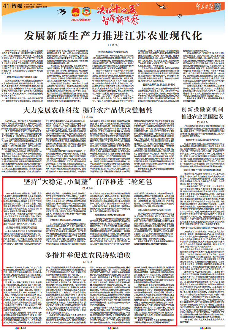 2025年中央一号文件提出,“坚持‘大稳定、小调整’,有序推进第二轮土地承包到期后再延长三十年试点,扩大整省试点范围,妥善化解延包中的矛盾纠纷,确保绝大多数农户承包地总体顺延、保持稳定”。稳妥有序推进二轮延包不仅是稳定和完善农村土地承包关系的重要举措,还是推动农村经济发展、贯彻社会公平和农民权益保障理念的重要决策部署。