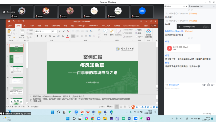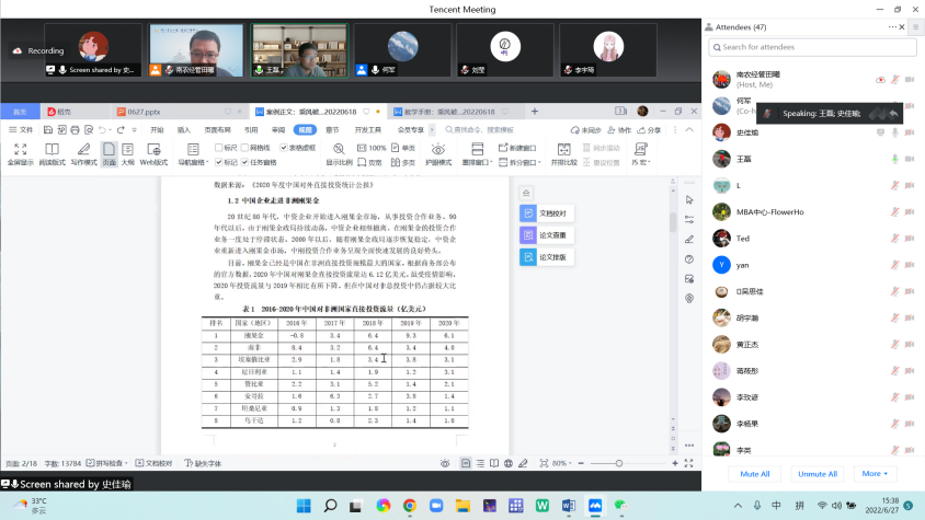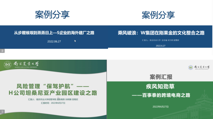 2022年6月27日,437必赢会员中心国际商务案例建设研讨会在线举办。会上就4篇师生共同撰写的案例进行分享与点评。会议由管理系系主任何军教授主持。山东省对外经济学会副秘书长、山东财经大学国际经济系王磊副教授点评。学院田曦教授、虞祎副教授、谢超平副教授,杨璐副教授及MBA中心刘莹老师,工商管理(MBA)专业硕士、国际商务(MIB)专业硕士等约60人线上参与。