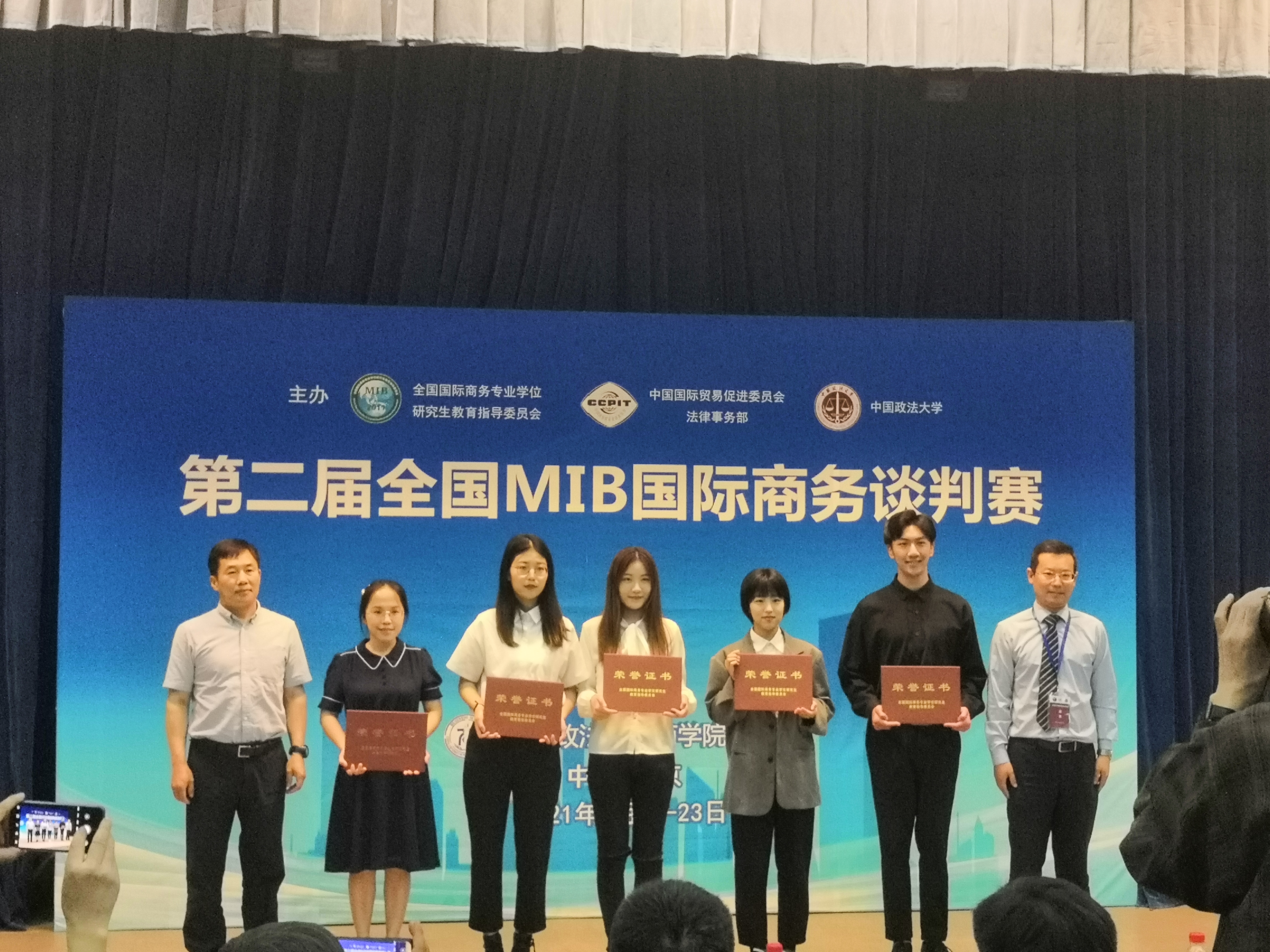 2021年5月22日至23日,第二届全国MIB国际商务谈判邀请赛在中国政法大学举行。我院2020级国际商务硕士杨倩(队长)、何美、邵奇、许美玲、谢东旭、景腊腊、邹欢欢组成的代表队在指导老师何军、田曦及杨璐的带领下参赛。经过激烈的角逐,代表队获得了本次大赛团队三等奖,何军教授和杨璐副教授荣获优秀指导老师。